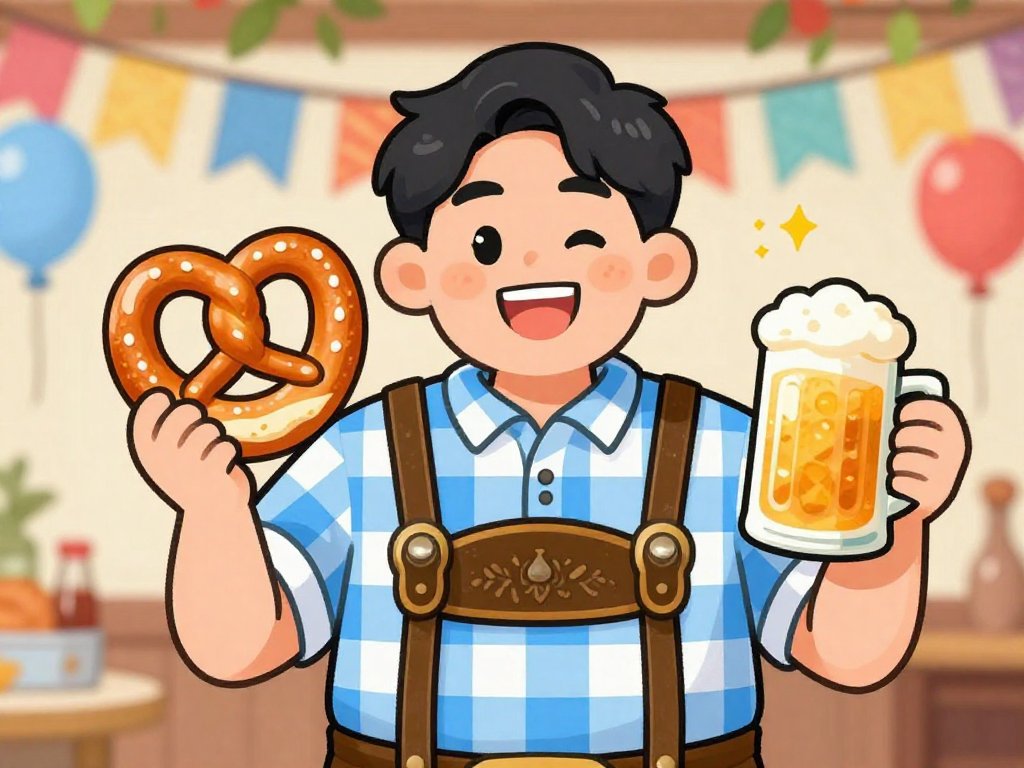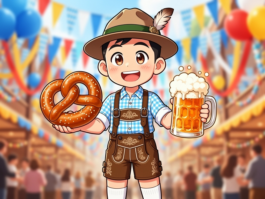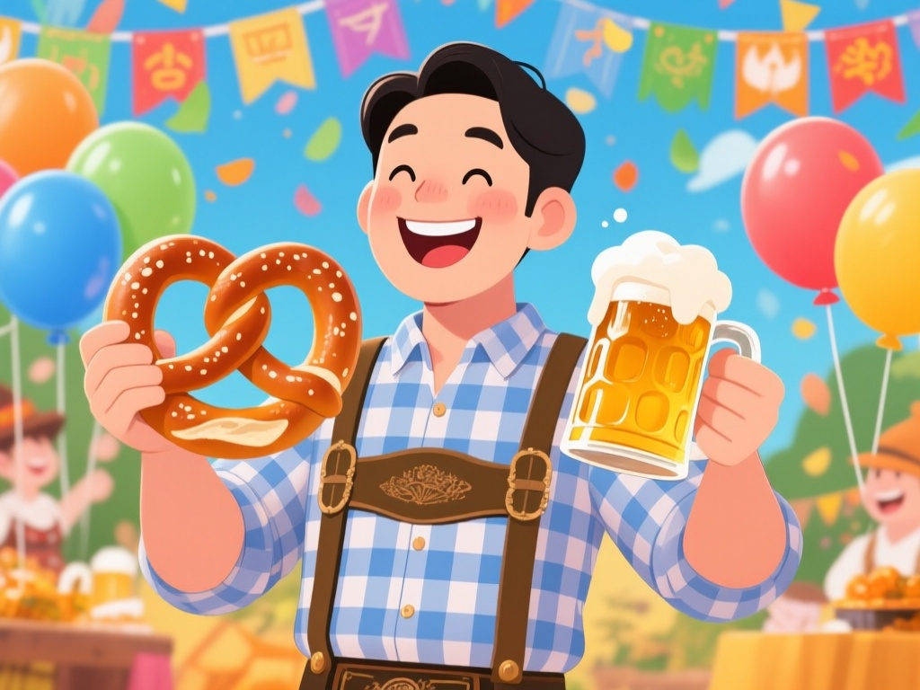 “an asian man wearing traditional oktoberfest lederhosen and a checkered shirt smiles brightly in the style of a korean cartoon. his eyes sparkle with joy as he holds a large pretzel in one hand and a beer stein in the other. the background is filled with festive decorations, including colorful banners and balloons.”1/4